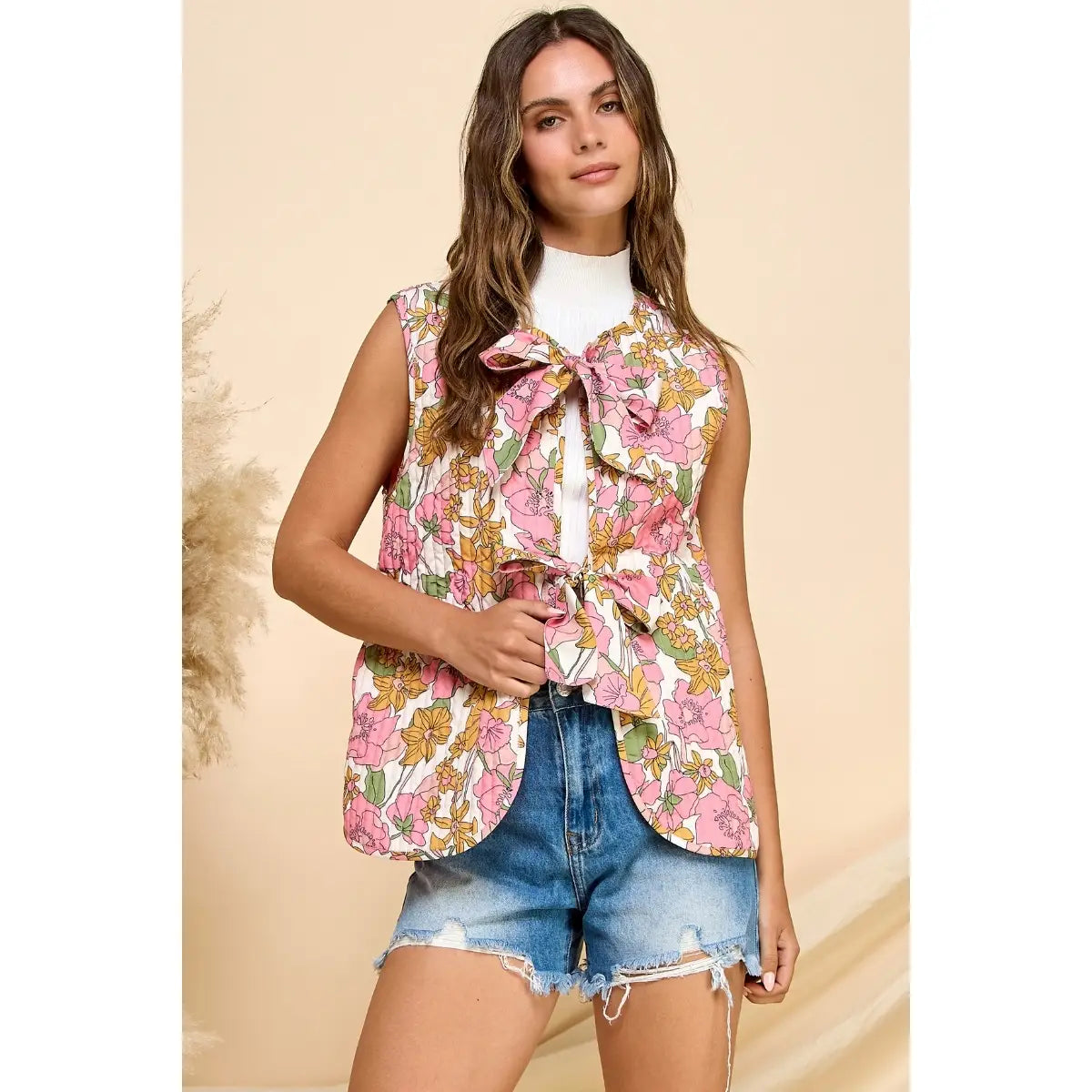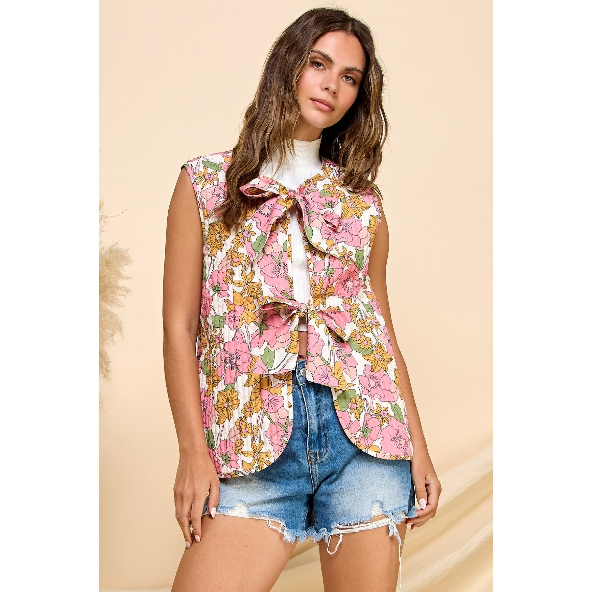 Lightweight quilted vest with printed stripe texture and soft ribbon-tie closure. Features a curved hem and reversible solid lining for two looks in one. Perfect for fall layering and soft girl styling.